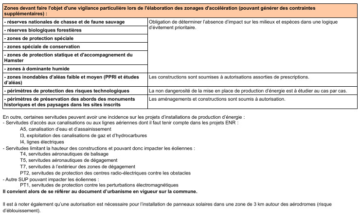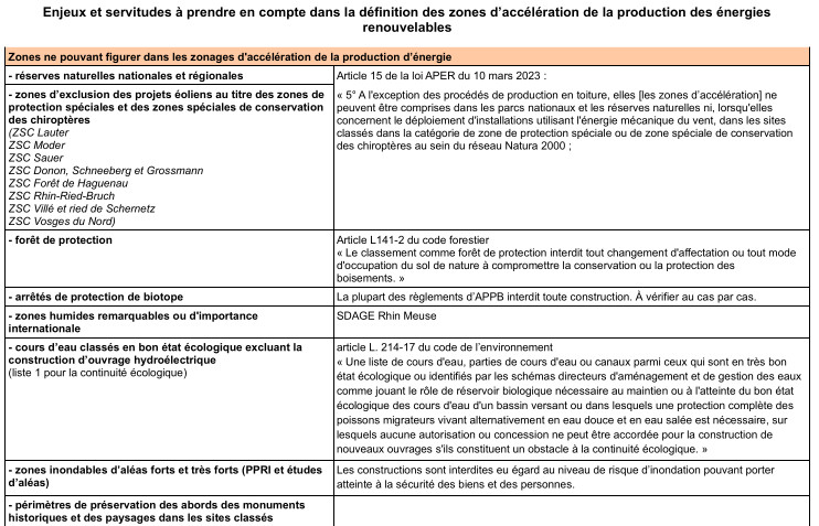 La DDT du Bas-Rhin a réalisé un atlas des enjeux environnementaux et servitudes s'appliquant aux installations d'énergies renouvelables accompagné d'une annexe méthodologique reproduite ci-dessous.